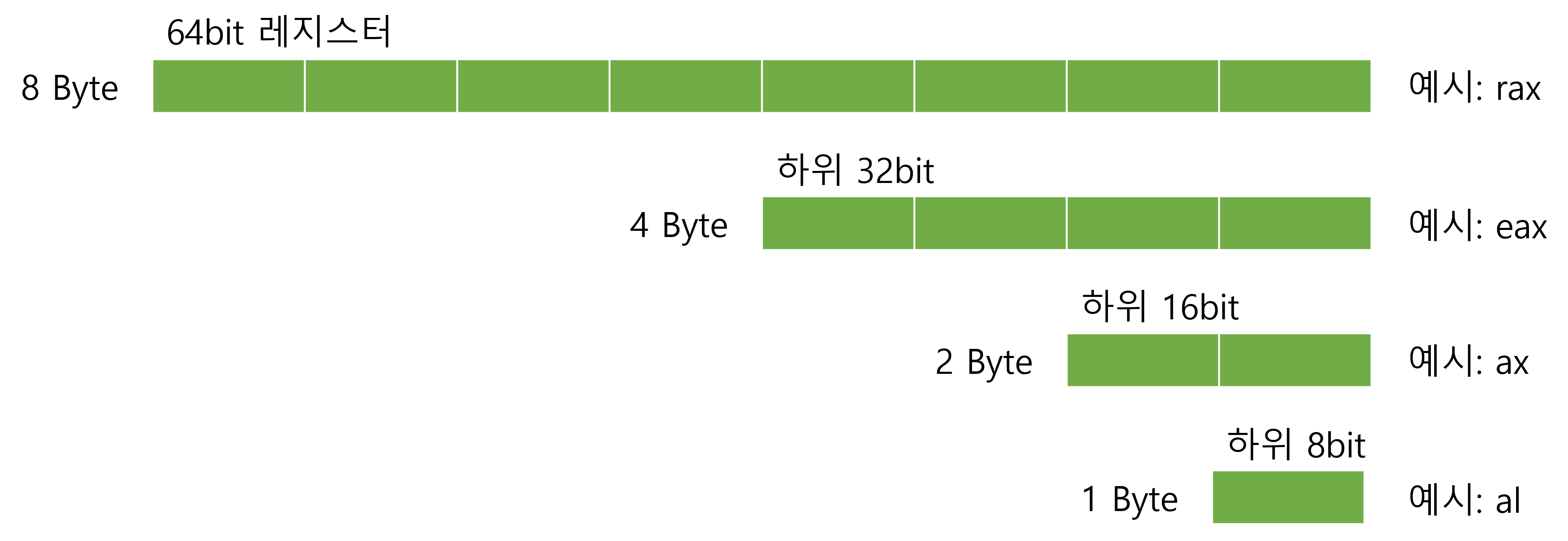 | 64비트 레지스터 | 하위 32비트 | 하위 16비트 | 하위 8비트 |