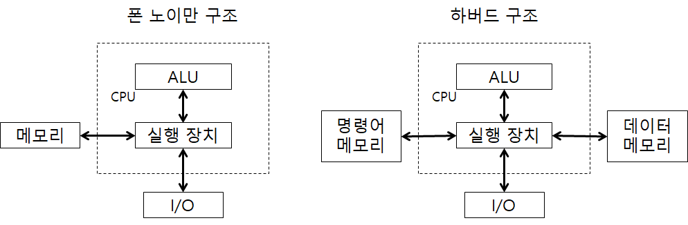 폰 노이만 구조와 하버드 구조입니다. 이 두 구조는 메모리의 배열에 차이가 있습니다. 폰 노이만 구조는 많이 사용되는 구조이지만 메모리에서 데이터와 명령어를 한 번에 처리하기에 하버드보다 느리다는 특징이 있습니다. 하버드 구조는 명령어와 데이터 메모리를 나누었기 때문에 이를 처리하기 위한 버스가 추가로 필요하다는 특징이 있습니다.