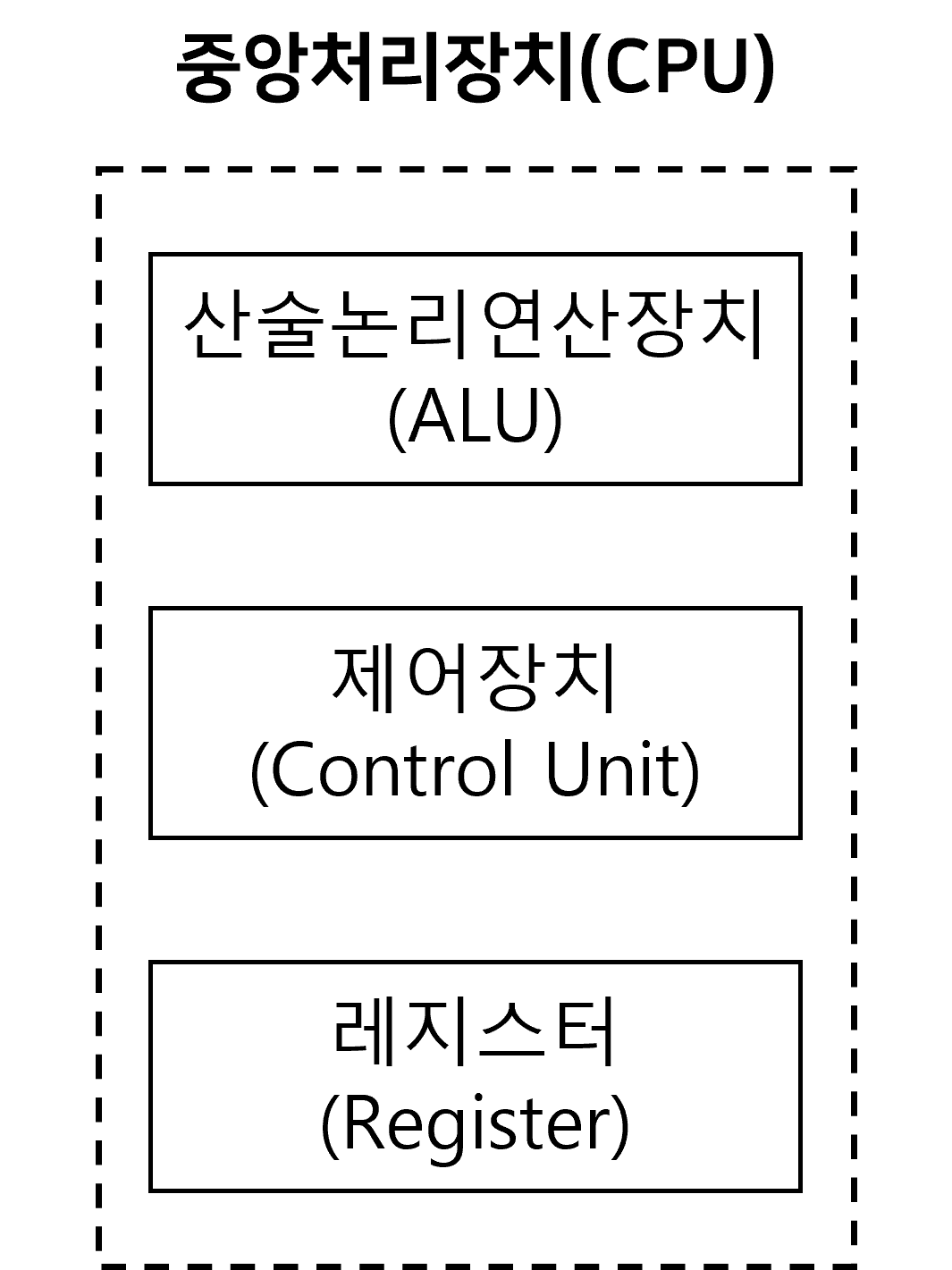 CPU는 아래 그림과 같이 산술논리장치와 제어장치, 레지스터로 구성됩니다.