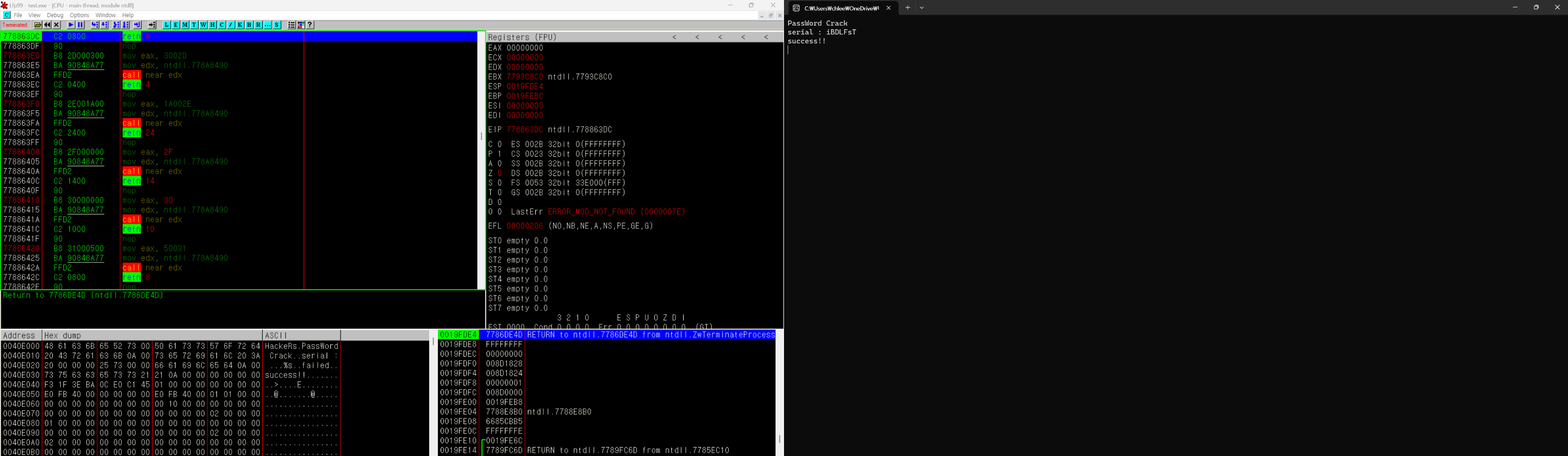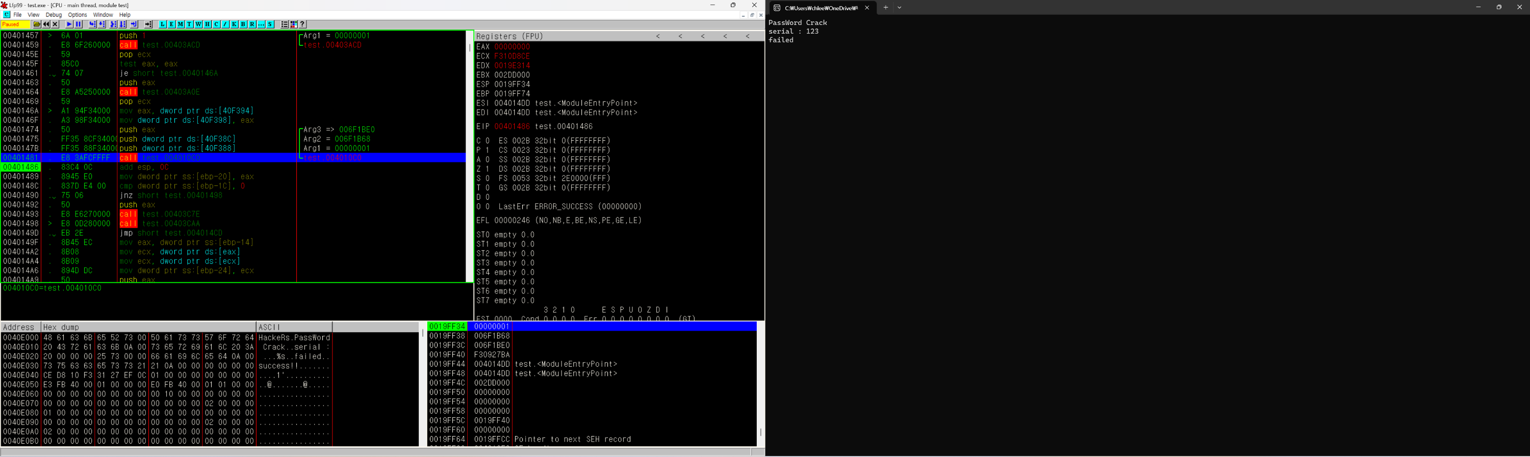 serial도 마찬가지로 스택에 추가해서 test.0040128E call 호출해 프로그램에서 출력되게 한다.