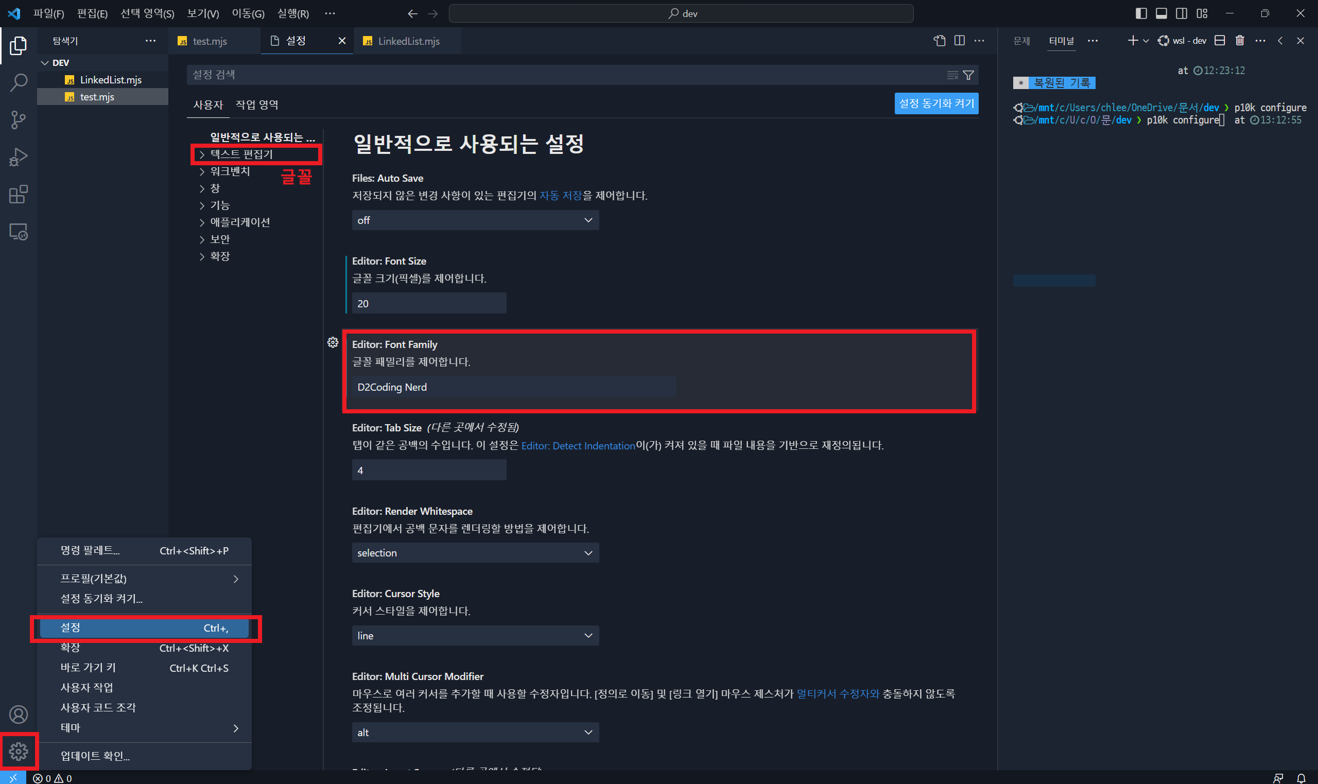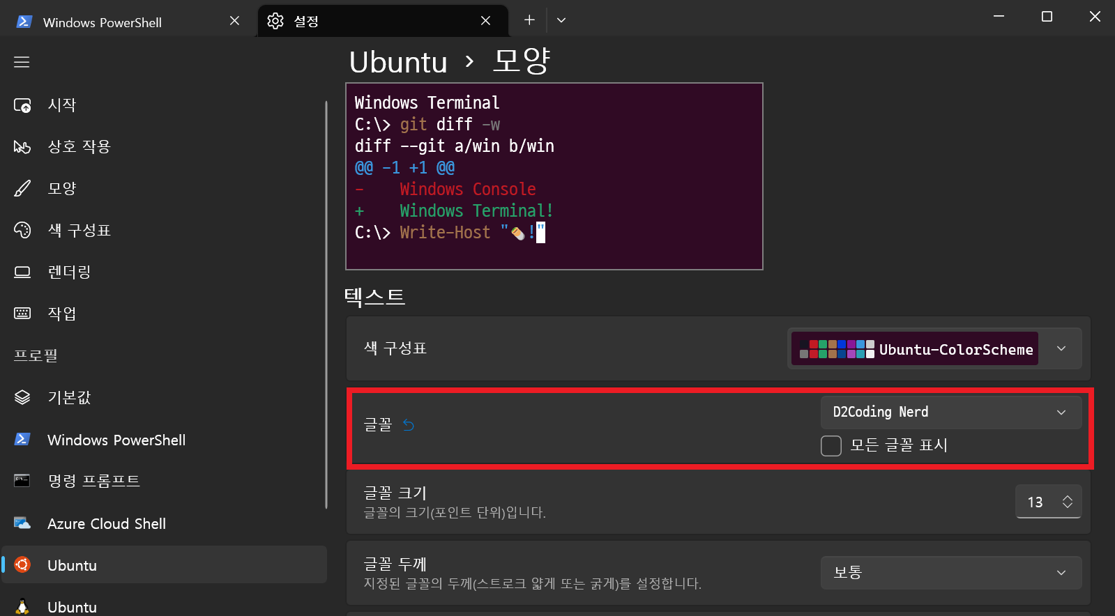 WSL(윈도우 터미널에서 접속)에서 폰트를 설정하고자 한다면 아래 내용을 참고해 봐요.