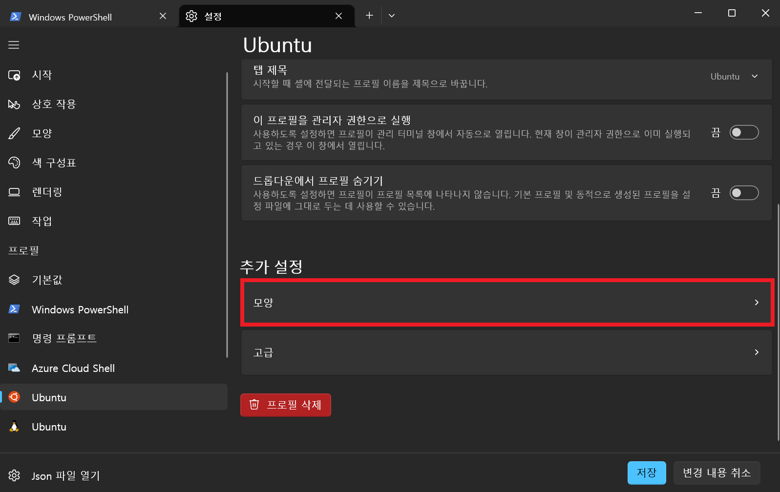 5. 아래로 내려서 모양을 클릭합니다.