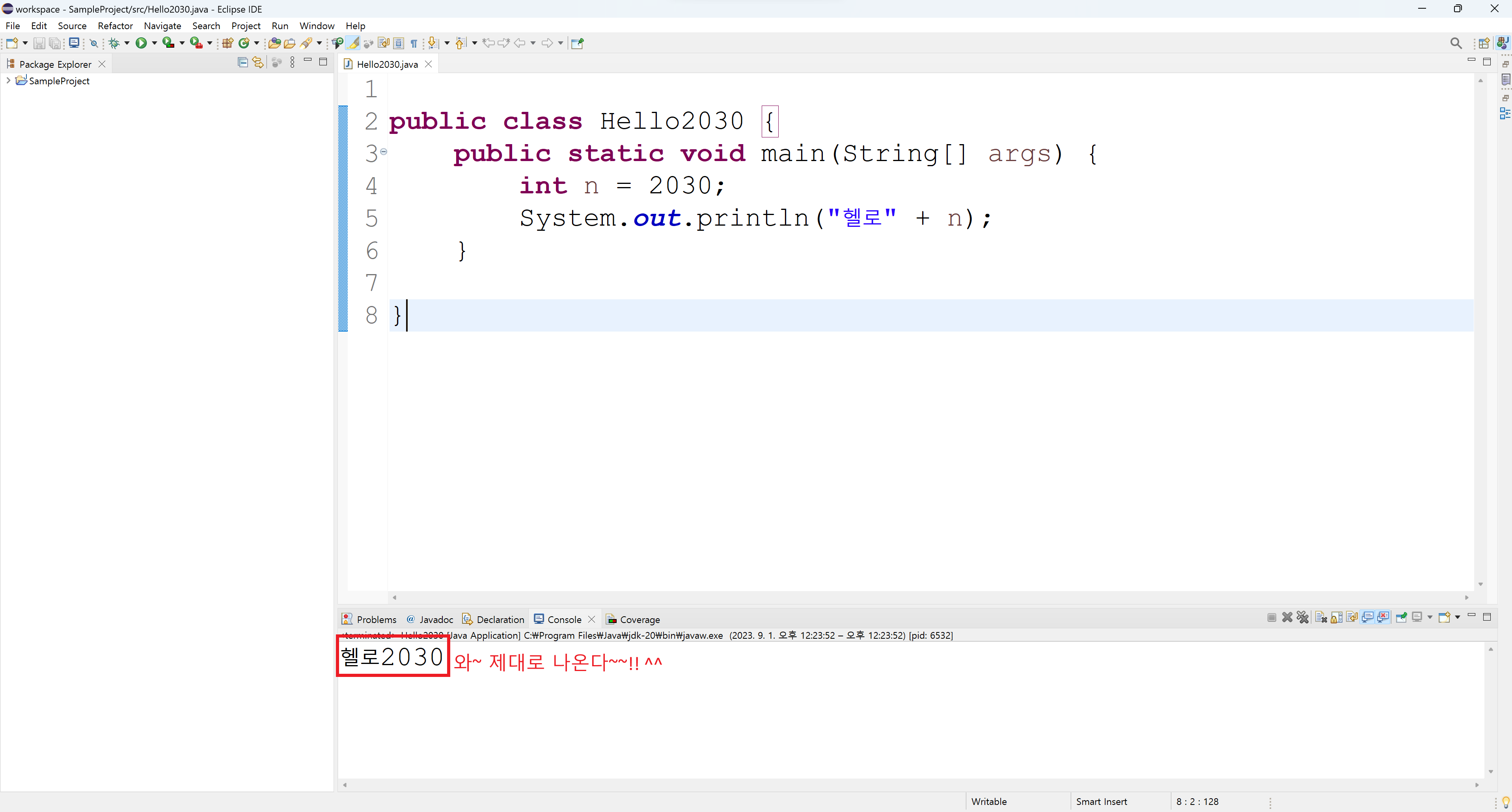 4. 다시 Console 창을 확인해보시면 드디어 한글로 제대로 된 출력 결과가 나오는 것을 확인할 수 있습니다.