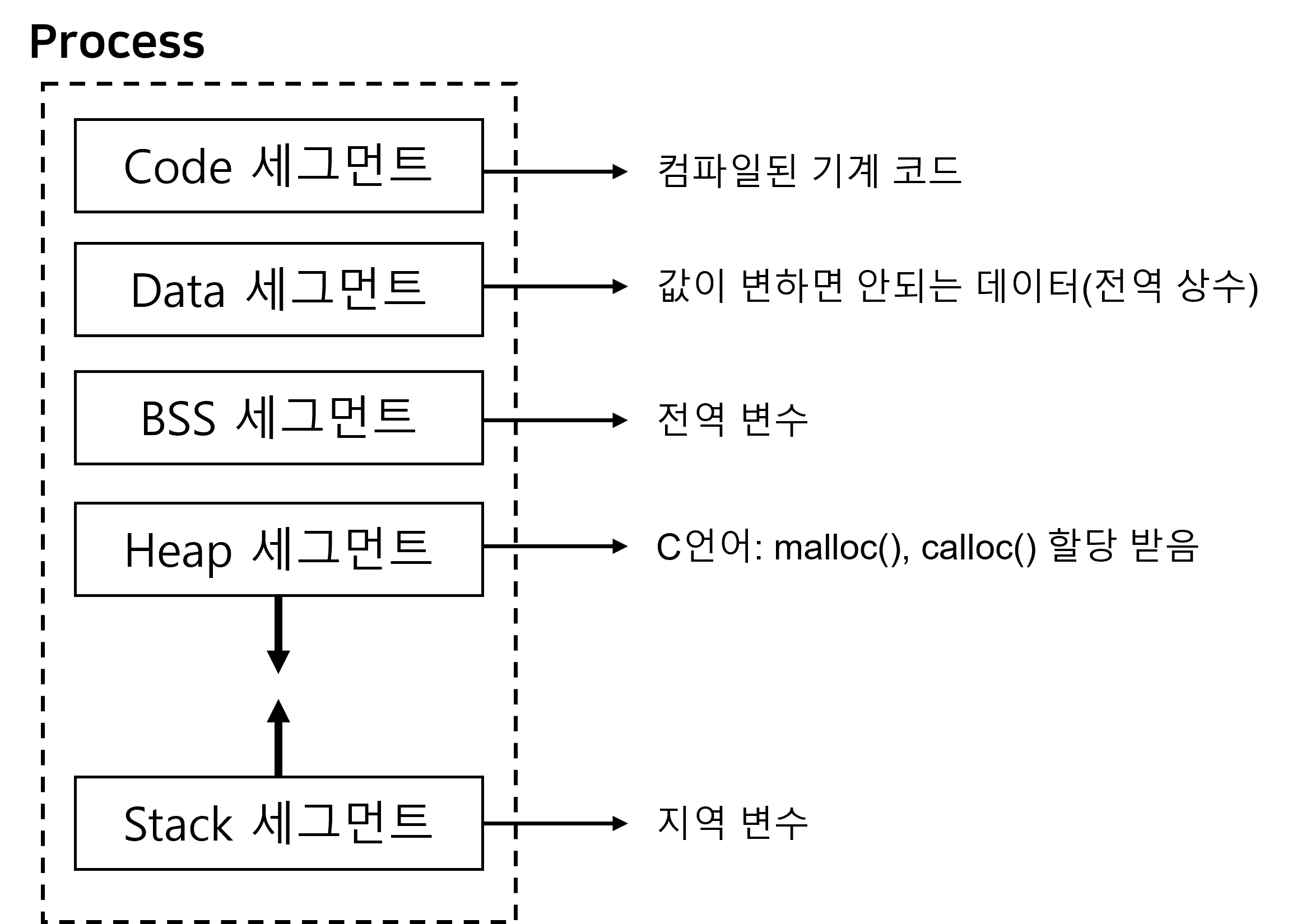 | 힙 세그먼트 | 읽기 | O | C언어에서 malloc(), calloc() 등 동적 할당 메모리 영역 |