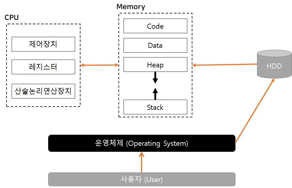 먼저 사용자가 운영체제에 명령을 전달합니다. 운영체제는 보조기억장치(여기서는 HDD)에서 관련 자료을 읽어 메모리(Memory)에 전달합니다. 그 다음 연산이 필요한 부분을 CPU에 전달하고 메모리가 결과를 받아올 수 있습니다. 메모리 구조를 더 자세히 살펴보겠습니다.