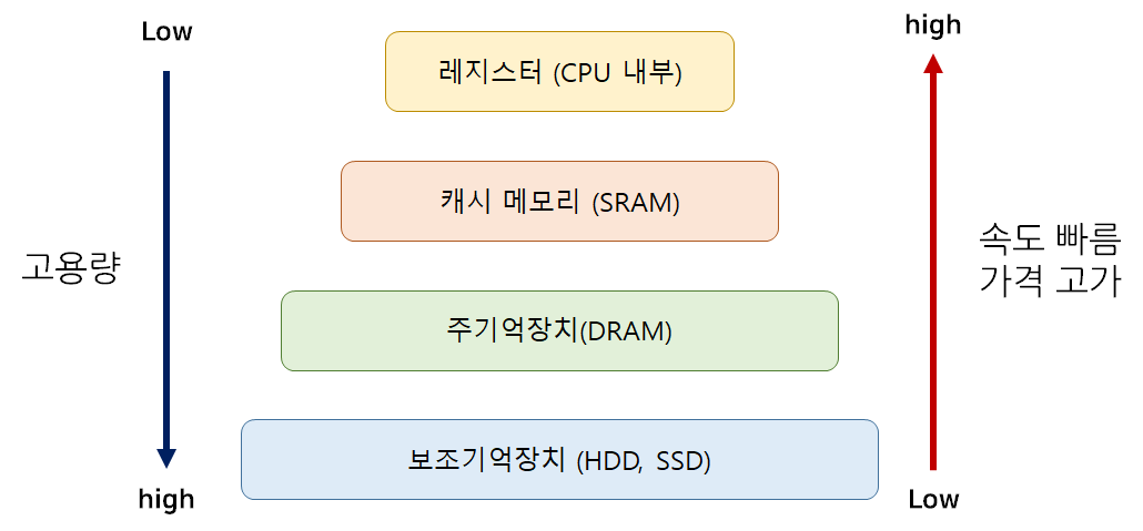 컴퓨터 저장장치는 어떤 것이 있을까요? 우선 저장장치의 계층을 살펴보겠습니다.